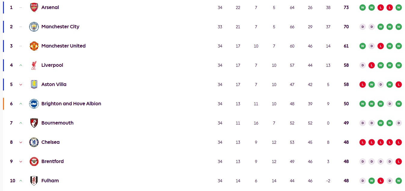 Vòng 34 Ngoại hạng Anh 2025/26 đã khép lại sau trận đấu của Man United với Brentford. Chiến thắng trên sân nhà giúp đoàn quân của Michael Carrick xây chắc vị trí thứ 3 trên Bảng xếp hạng với 61 điểm.