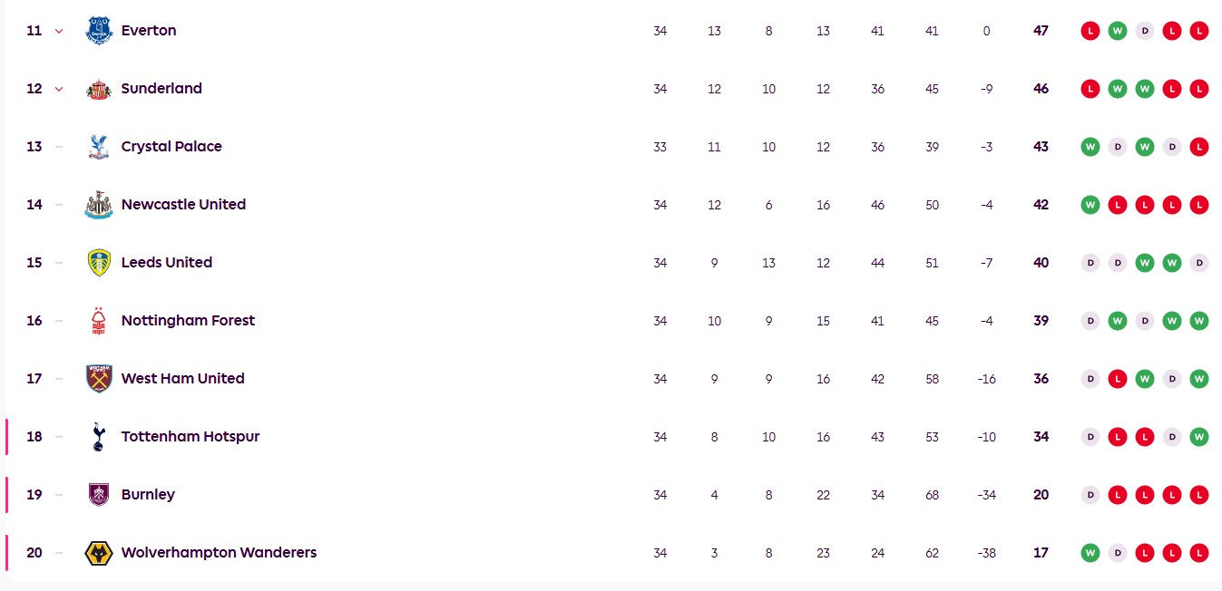 Ở nhóm cuối bảng, Burnley và Wolves là hai đội đã chính thức xuống chơi ở Championship mùa tới. Câu chuyện bây giờ là cuộc cạnh tranh của các đội như Leeds United, West Ham, Nottingham Forest và Tottenham.