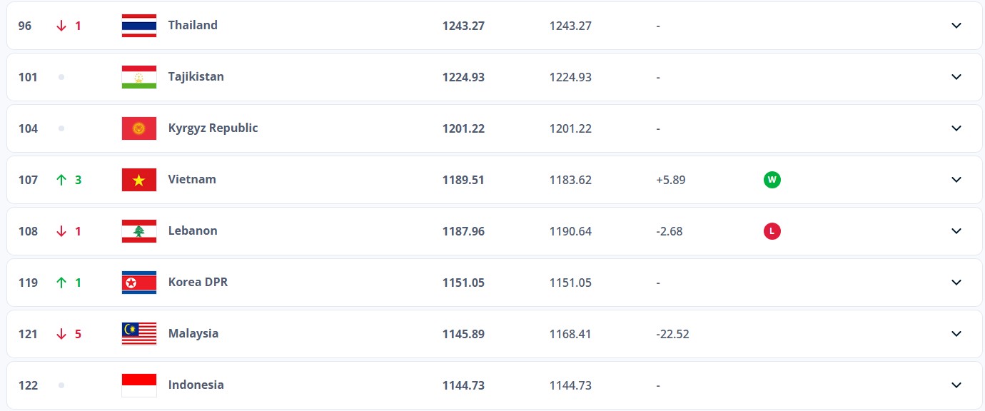 Với việc cộng thêm 5,89 điểm, "những chiến binh sao vàng" tiến sát top 100, trong khi Thái Lan lại giảm một bậc xuống hạng 96. Trong bối cảnh khu vực châu Á ngày càng cạnh tranh khốc liệt, việc duy trì đà thăng hạng đều đặn được xem là tín hiệu tích cực cho tham vọng dài hạn của bóng đá Việt Nam.