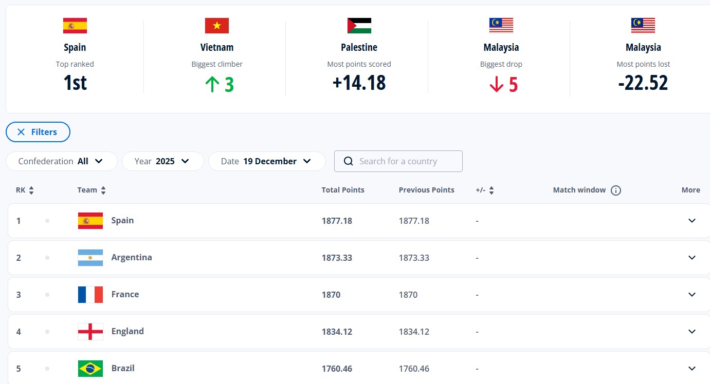 Theo cập nhật mới nhất, đội tuyển Việt Nam tăng 3 bậc, vươn lên vị trí 107 thế giới. Đây là bước tiến mạnh mẽ, giúp Việt Nam cùng Singapore trở thành những đội tuyển cải thiện thứ hạng nhiều nhất Thế giới trong tháng 12. Thành quả này đến từ chuỗi kết quả khả quan và quá trình ổn định lực lượng dưới sự dẫn dắt của HLV Kim Sang-sik.