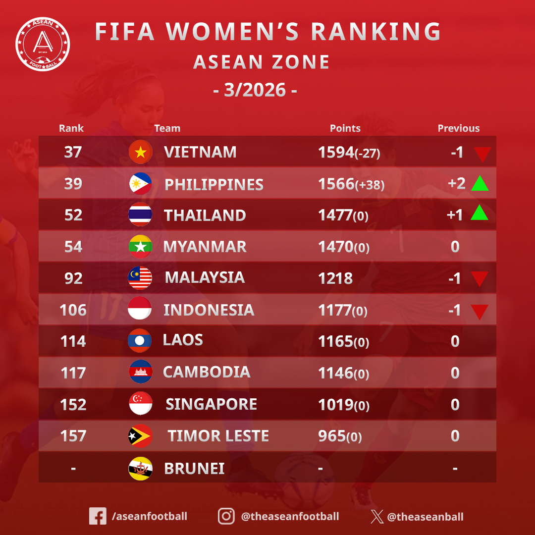Dù tiếp tục dẫn đầu khu vực, thầy trò HLV Mai Đức Chung bị trừ điểm khá nhiều trong đợt cập nhật này. Cụ thể, tuyển nữ Việt Nam hiện có 1.594 điểm, giảm 27 điểm so với trước đó. Nguyên nhân chủ yếu đến từ màn trình diễn chưa như kỳ vọng tại VCK Asian Cup 2026, nơi đội lần lượt thất bại trước Đài Bắc Trung Hoa và Nhật Bản.