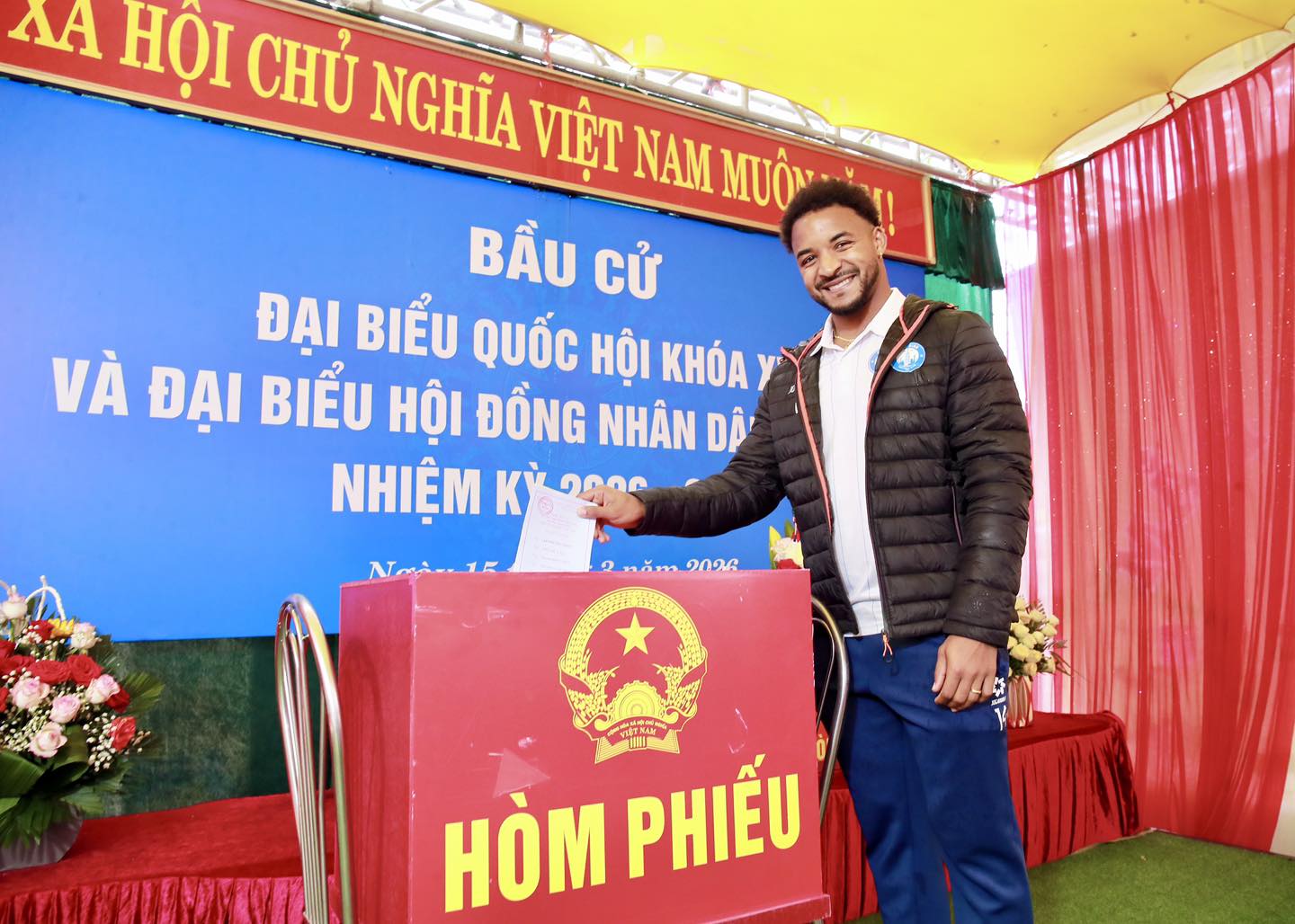 Tại Hà Nội, tiền vệ Đỗ Hoàng Hên thức dậy từ rất sớm để chuẩn bị cho ngày bầu cử. Sau hơn 5 năm sinh sống tại Việt Nam, cầu thủ 32 tuổi chính thức có quốc tịch từ tháng 10/2025. Dù chưa thực sự thành thạo tiếng Việt, anh vẫn nhận được sự hỗ trợ nhiệt tình từ cán bộ tại điểm bầu cử và các cử tri xung quanh. Nhiều người hâm mộ cũng tranh thủ xin chụp ảnh lưu niệm với tiền vệ này.