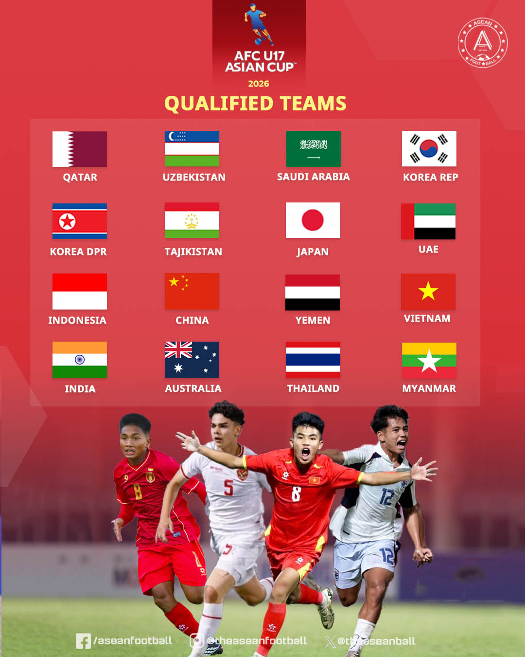 Ngoài Việt Nam, sáu đội khác cũng xuất sắc đứng đầu bảng để góp mặt tại vòng chung kết gồm Trung Quốc, Yemen, Ấn Độ, Úc, Thái Lan và Myanmar. Bên cạnh đó, chín đội tuyển mạnh khác như Ả Rập Xê Út, Qatar, Uzbekistan, Hàn Quốc, Triều Tiên, Nhật Bản, Indonesia, UAE và Tajikistan được đặc cách tham dự. Tổng cộng, 16 đội sẽ tranh tài tại VCK U17 châu Á 2026.