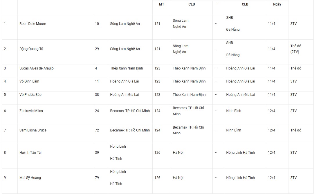 Theo thông báo chính thức, hàng loạt cái tên buộc phải vắng mặt vì án treo giò, xuất phát từ thẻ đỏ hoặc đã tích lũy đủ 3 thẻ vàng. Điều này khiến không ít CLB rơi vào tình thế khó khăn khi phải xoay tua đội hình trong bối cảnh lịch thi đấu ngày càng căng thẳng.