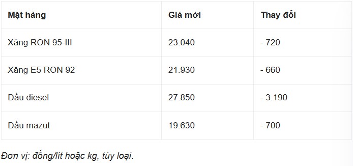 Theo điều chỉnh mới nhất của Liên bộ Công Thương - Tài chính, giá xăng RON 95-III giảm 720 đồng, xuống còn 23.040 đồng một lít. Tương tự, E5 RON 92 giảm 660 đồng, giá chỉ còn 21.930 đồng.