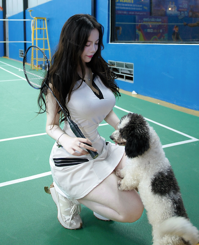 Điểm đặc biệt nằm ở chỗ, Thúy Diễm không cần tạo dáng quá cầu kỳ hay khoe hình thể một cách phô trương. Chính sự tự nhiên, dịu dàng cùng nét nữ tính nổi bật trong không gian sân cầu lông xanh mát lại càng làm tôn lên vẻ ngoài trong trẻo và dễ gây thiện cảm của cô nàng.