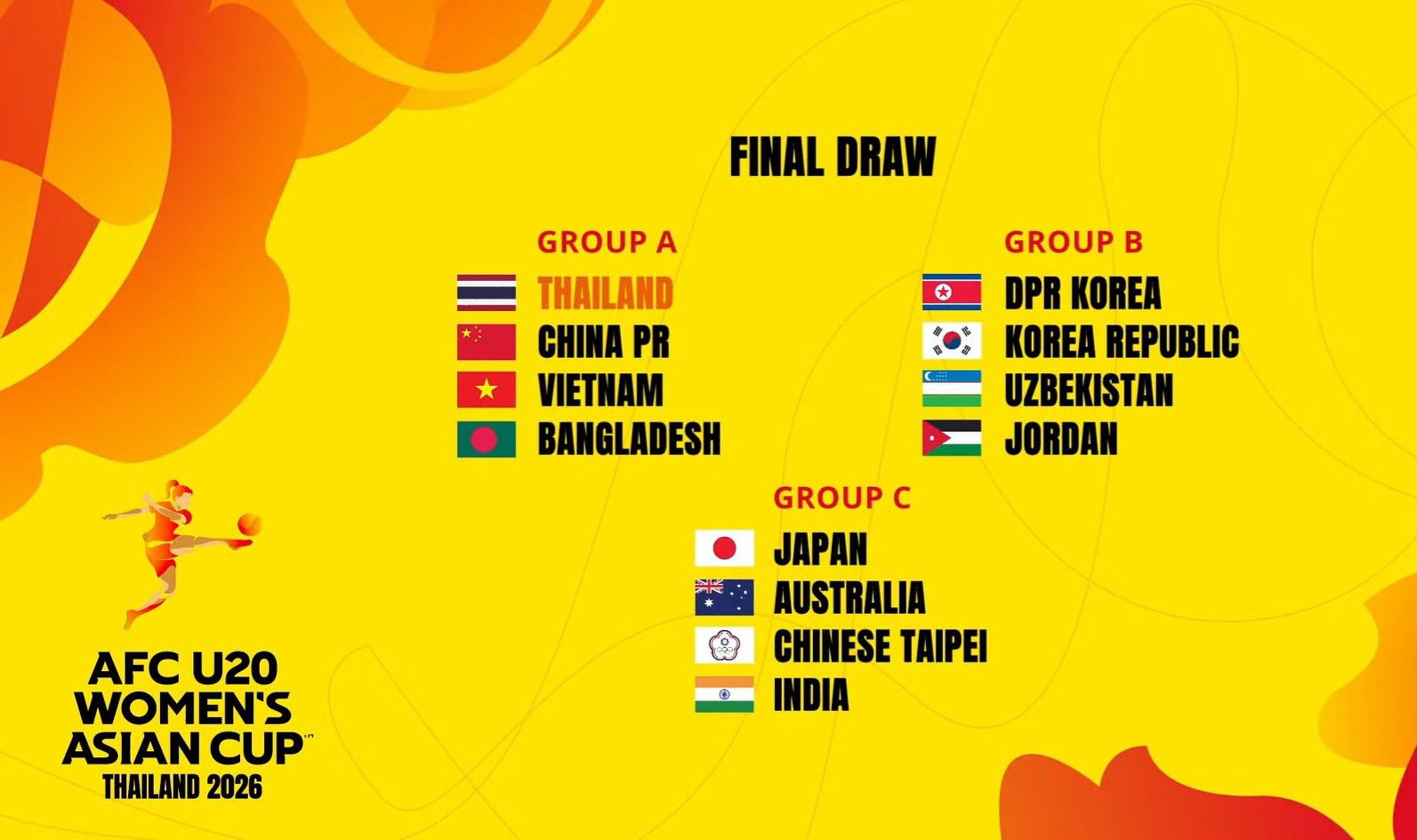 Giải đấu sẽ diễn ra từ ngày 1 đến 18/4/2026 tại Thái Lan. Theo thể thức, 8 đội vào tứ kết sẽ cạnh tranh suất dự World Cup U20 nữ 2026 tại Ba Lan – nơi chỉ dành cho 4 đội xuất sắc nhất.