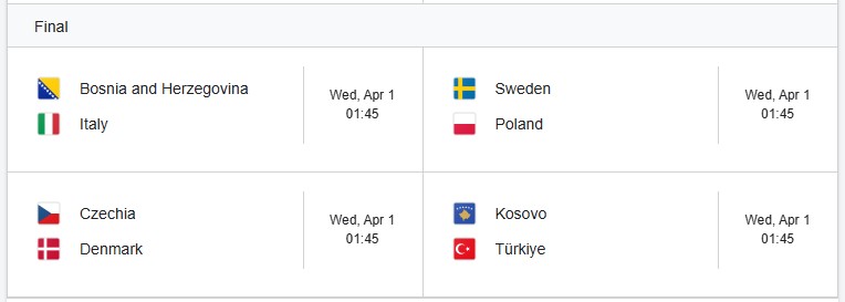 Đã có những bất ngờ xảy ra ở Bán kết khi Xứ Wales nhận thất bại trước Bosnia & Herzegovina ở loạt sút luân lưu đầy may rủi. Trong khi đó, những đại diện được đánh giá khá cao là Ukraine và Romania cũng chính thức nói lời tạm biệt với tấm vé tham dự World Cup 2026.