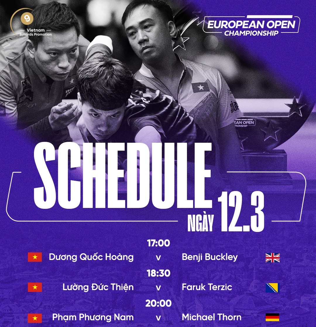 Trong ngày 12/3, cả Hoàng Sao, Nam Phạm và Thiện Lương đều thi đấu. Dương Quốc Hoàng sẽ gặp đối thủ người Anh Benji Buckley lúc 17h. Lường Đức Thiện chạm trán tay cơ chủ nhà Faruk Terzic lúc 18h và Phạm Phương Nam là cơ thủ Việt Nam thi đấu muộn nhất khi đối đầu cơ thủ người Đức Michael Thorn lúc 20h30.