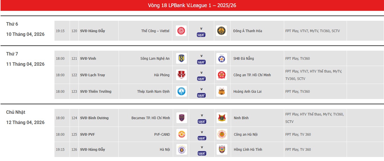 3 trận đấu cuối cùng của vòng 18 sẽ diễn ra vào ngày 12/4 với tâm điểm là trận Derby ngành công an giữa PVF-CAND và CLB Công an Hà Nội. Ngoài ra, Becamex TP.HCM sẽ tiếp đón Ninh Bình và Hà Nội FC sẽ chạm trán với Hồng Lĩnh Hà Tĩnh.