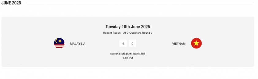 Trước đó, AFC đã ra quyết định xử thua 0-3 đối với Malaysia trong các trận gặp Việt Nam và Nepal do vi phạm quy định liên quan đến cầu thủ. Tuy nhiên, trên website chính thức, FAM vẫn hiển thị tỷ số 4-0 trước Việt Nam như kết quả ban đầu trên sân, thay vì cập nhật theo phán quyết mới nhất, khiến dư luận không khỏi bất ngờ.