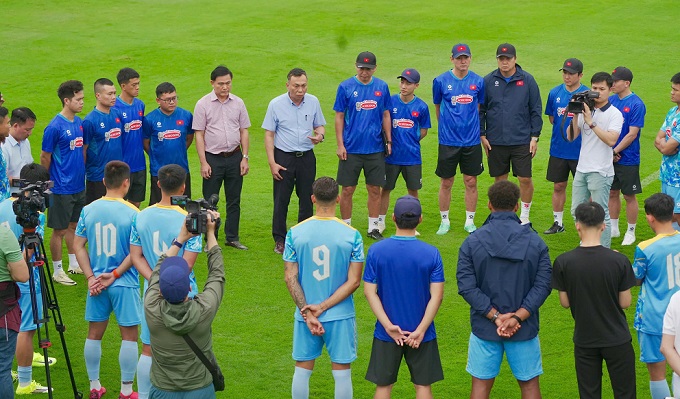 Nhằm tiếp thêm động lực cho Đội tuyển Việt Nam trước trận gặp Malaysia ở lượt cuối vòng loại Asian Cup 2027, ngày 23/3, lãnh đạo Liên đoàn Bóng đá Việt Nam đã có buổi gặp gỡ toàn đội tại Trung tâm đào tạo bóng đá trẻ Việt Nam. Chủ tịch Trần Quốc Tuấn cùng Phó chủ tịch Trần Anh Tú trực tiếp động viên tinh thần thầy trò HLV Kim Sang Sik.