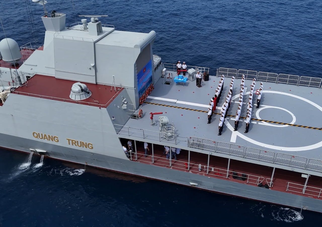 Buổi lễ được tổ chức trên sân trực thăng của tàu, do đại tá Nguyễn Minh Lành - Phó tham mưu trưởng Vùng 4 Hải quân, trưởng đoàn công tác - chủ trì.