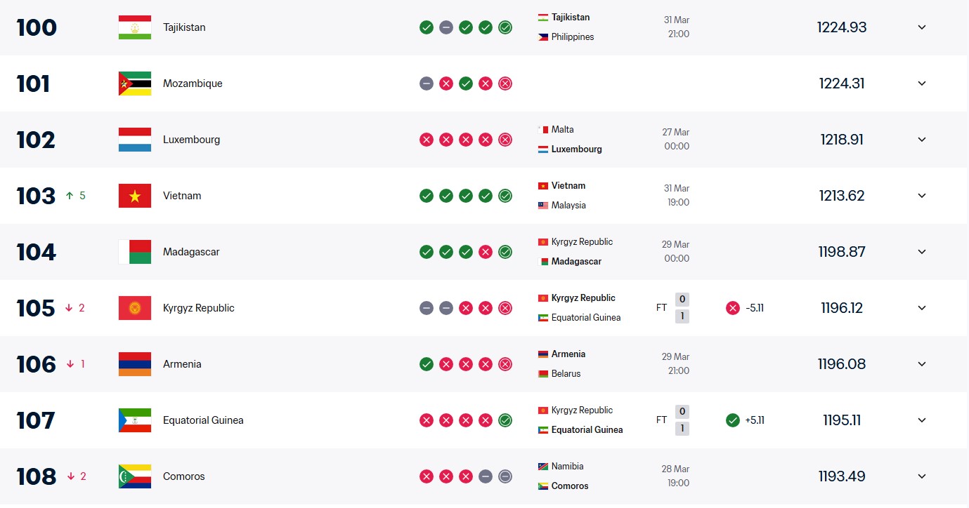 Số điểm này cũng không thể giúp ĐT Việt Nam cải thiện vị trí trên BXH FIFA. Hiện tại, ĐT Việt Nam đang đứng thứ 103 Thế giới với 1213.62 điểm, kém đội xếp trên là Luxembourg 5 điểm.