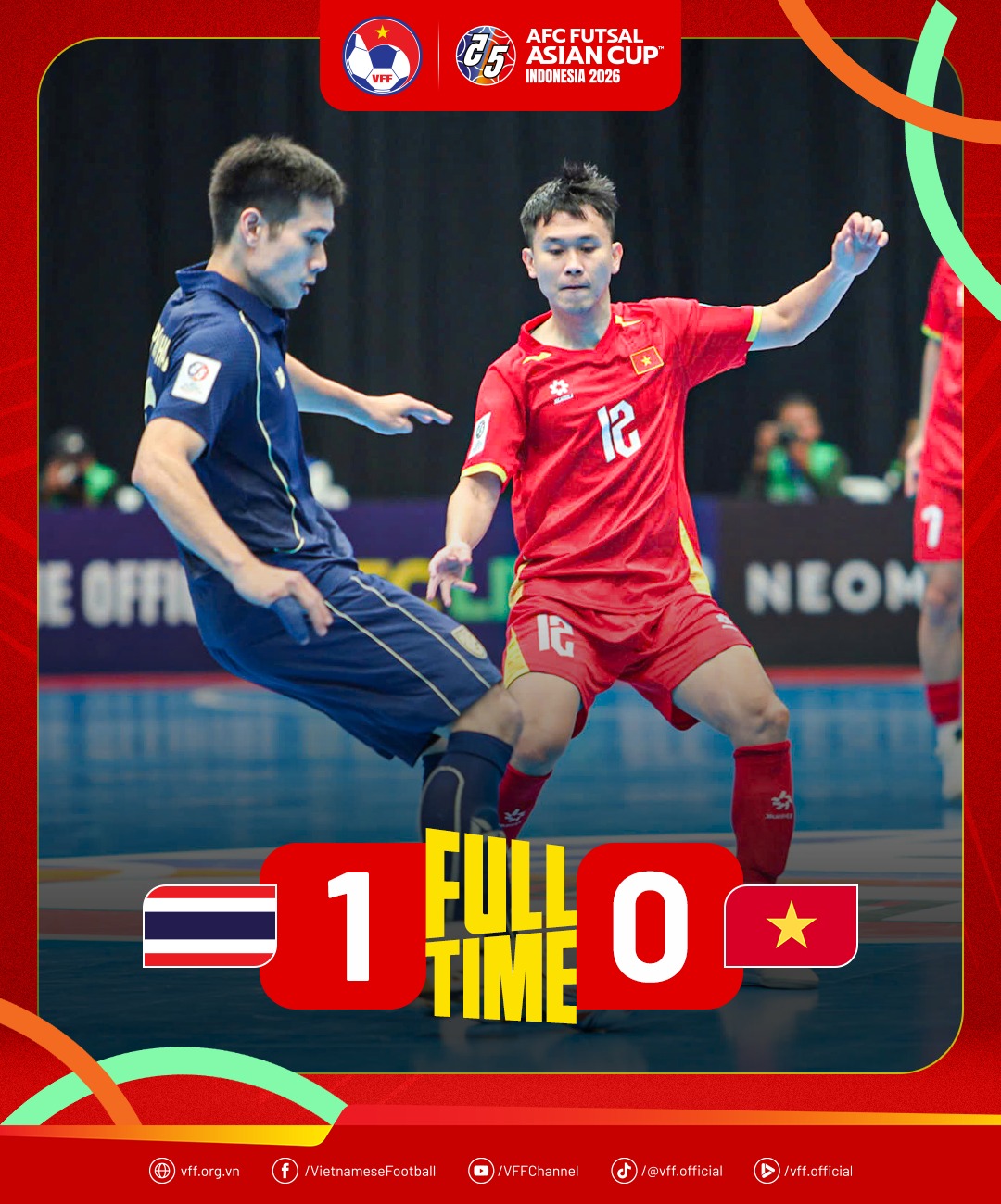 Chiều nay theo giờ Việt Nam, đội tuyển futsal Việt Nam bước vào trận đấu cuối cùng tại bảng B VCK futsal châu Á với đối thủ nhiều duyên nợ Thái Lan. Cuộc so tài diễn ra đúng với kỳ vọng khi hai đội chơi ăn miếng trả miếng trong suốt 40 phút. Dù rất nỗ lực, thầy trò đội tuyển Việt Nam vẫn phải nhận thất bại sát nút 0-1, qua đó khép lại vòng bảng ở vị trí nhì bảng, trong khi Thái Lan giành ngôi đầu.