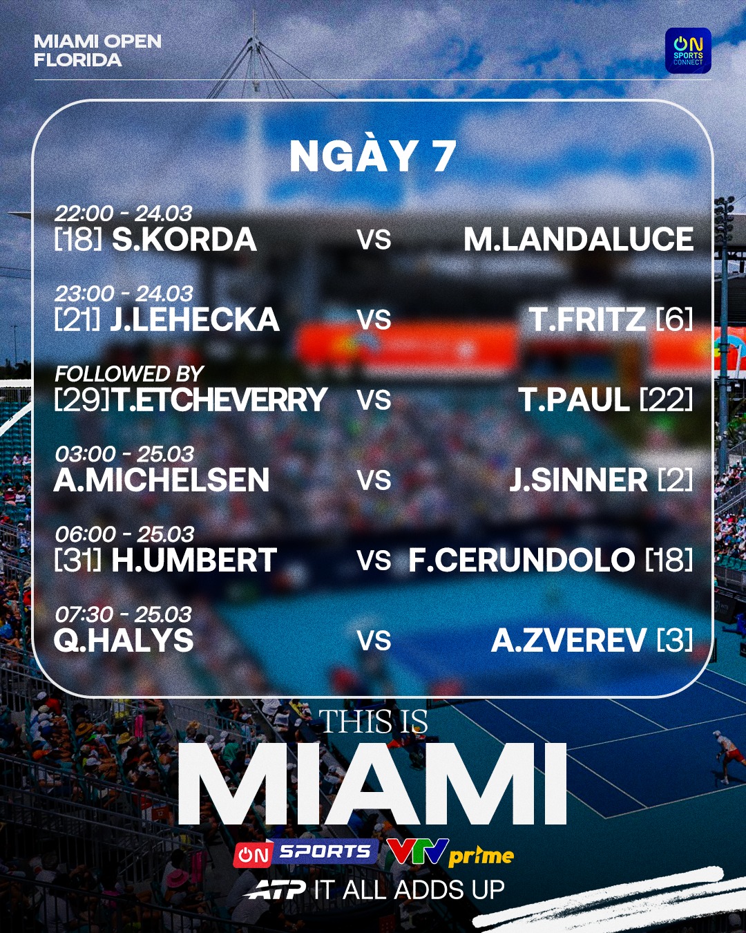 Sebastian Korda, người đã gây ra cú sốc lớn nhất ở giải đấu năm nay khi đánh bại Carlos Alcaraz sẽ so tài với Martin Landaluce ở vòng 4. Toàn bộ các trận đấu của Miami Open 2026 đều được trực tiếp trên On Sports và ứng dụng VTV Prime.